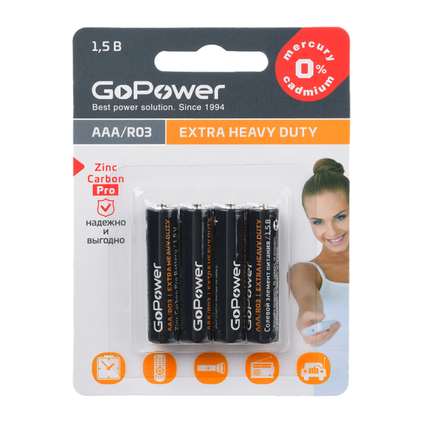 Батарейка GoPower Heavy Duty R03 (AAA) BL4 4/48/576