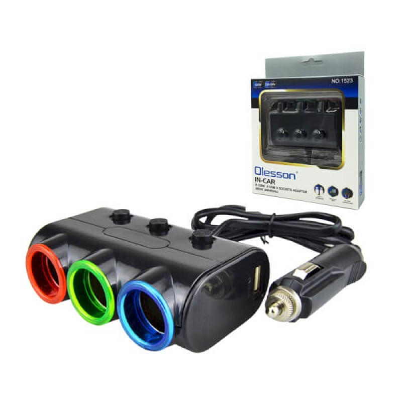 Разветвитель прикуривателя Olesson 1523, 3 выхода+2USB, черный