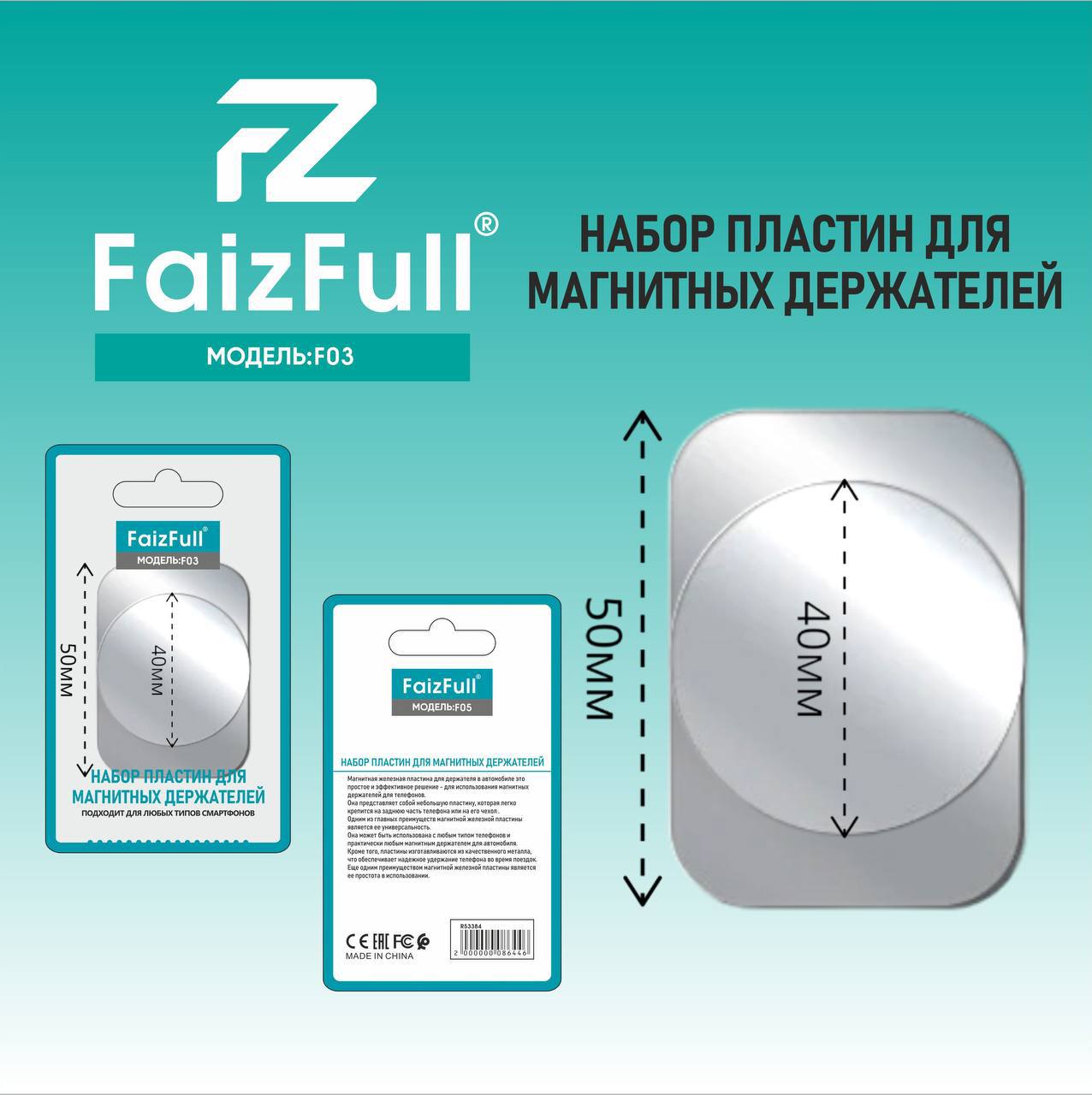 Самоклеящиеся металлические пластины для магнитного держателя FaizFull F03 серебристый (комплект 2шт