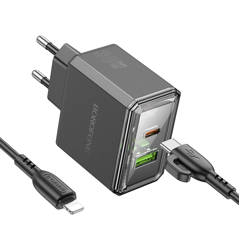 СЗУ BOROFONE BAS32A, 1USB/1Type-C, QC3.0+PD30W, 3А+Type-C/Lightning 1м, черный