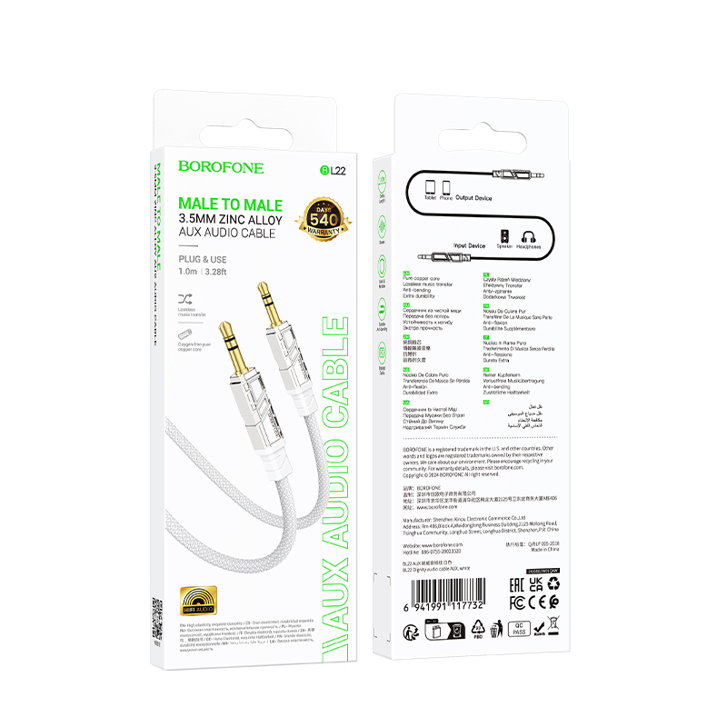 Кабель AUX 3.5мм (шт/шт) 1м BOROFONE BL22, тканевая оплетка, белый