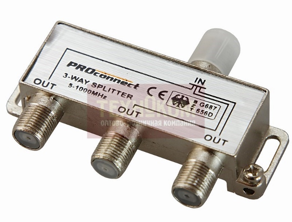 Телевизионный делитель или сплиттер незаменим в любой системе эфирного телевидения, а также в бытовых условиях, когда необходимо подключить к одной антенне несколько телевизоров или ресиверов. Делитель ТВ на 3 выхода под F-разъем предназначен для деления телевизионного сигнала, идущего от антенны к оборудованию, равномерно на число выходов. Данный ТВ сплиттер рассчитан под F разъём и имеет три выхода, т. е. сигнал, проходящий через сплиттер, делится на три части. Кабель подключается к этому делителю с помощью F-разъемов. Делитель подходит для сигналов, имеющих диапазон частот 5-1000 МГц, что соответствует эфирному телевидению.