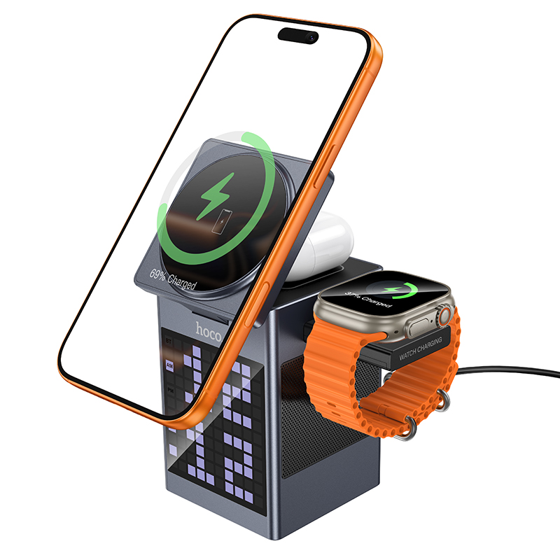 Колонка Hoco DWQ04+часы+беспроводная зарядка, серый